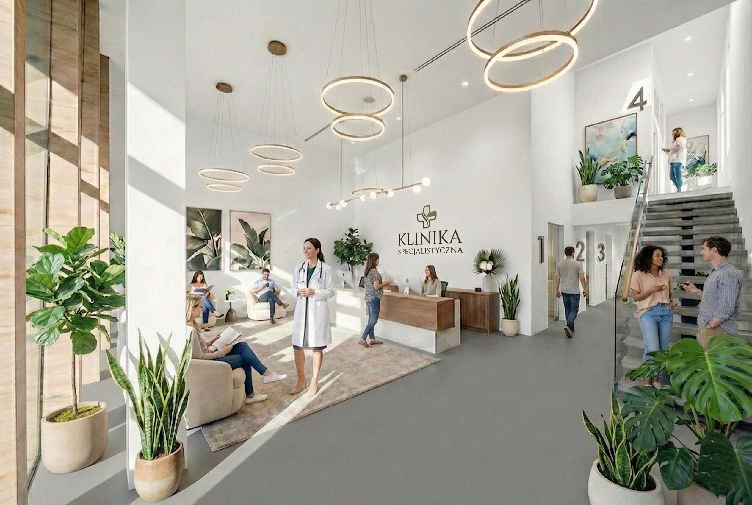 Dlaczego tutaj? Budynek po przystosowaniu wnętrz, spełni rygorystyczne wymogi Sanepidu (wysokość pomieszczeń). Możliwość wydzielenia strefy RTG, laboratorium i sterylnych gabinetów. Prestiżowa architektura buduje zaufanie pacjenta premium.